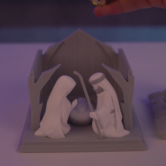 La luz cálida resalta las figuras y la estrella superior, creando un ambiente de paz ideal para quienes buscan una pieza navideña con un enfoque tradicional y a la vez moderno.